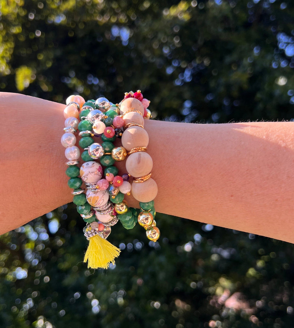 Made with wooden beads, green glass beads, gold hematite beads and gold plated heart charm